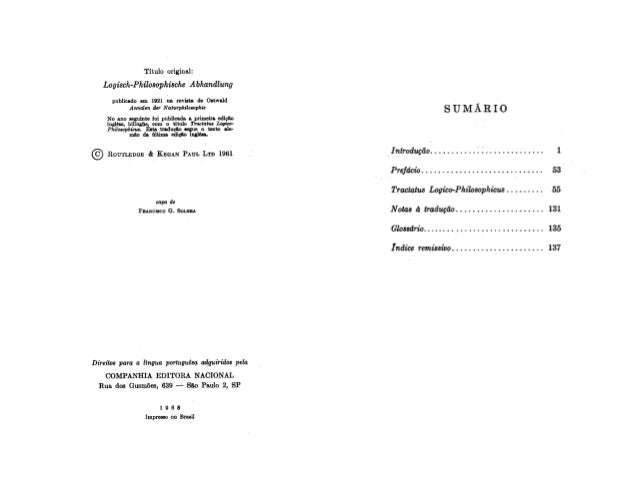 - 3. Direitos para a língua portuguesa adquiridos pela COMPANHIA EDITORA NACIONAL Rua dos Gusmões, 639 — São Paulo 2, SP Título original:Logisch-Philosophische Abhandlung publicado em 1921 na revista de Oatwald Annalen der Naturphilesephie No ano seguinte foi publicada a primeira edição inglêsa, bilíngüe, com o título Tractatua Logic°.Philoaephicua. Esta tradução segue o texto alemão da última edição inglêsa.O ROUTLEDGE & KEGAN PAUL LTD 1961 capa denus/cisco G. SOLERA19 88 Ingresso no Brasil